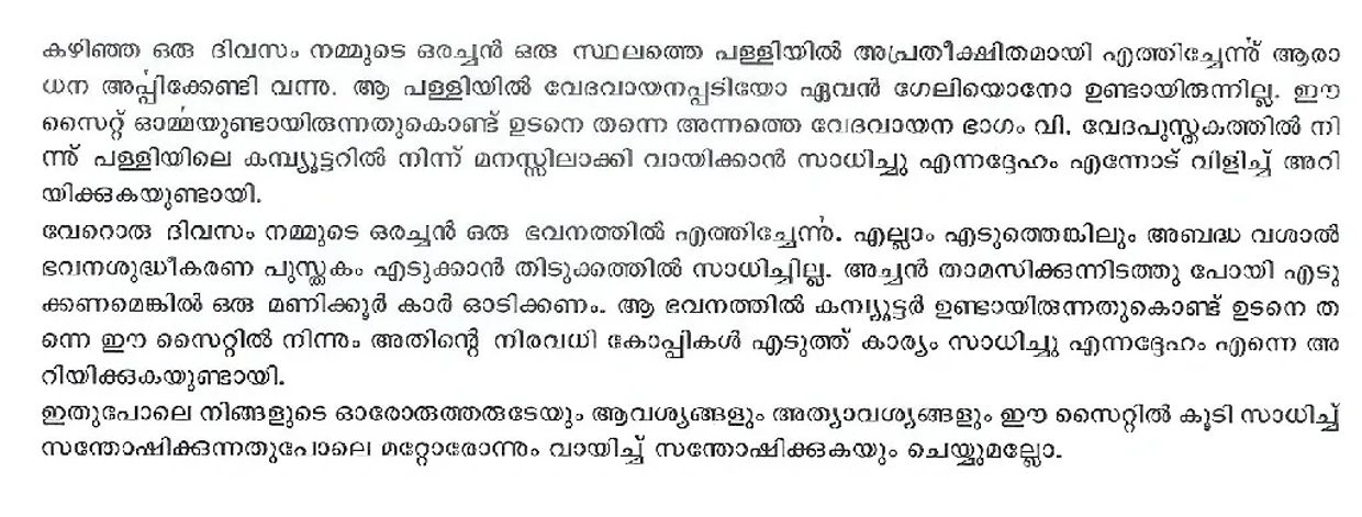 You can always look in the LATEST page and find out that what is published latest. For any suggestion please contact. Your suggestions are very much appreciated. The views and ideas expressed are entirely my own decision. The main purpose of this site is make use of all and not for hurting any one. Under the heading STORIES, every one can watch Malayalam proverbs and very small stories.
